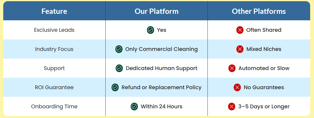 We stand out by offering you trusted, high-quality leads that deliver real results. Our commitment to transparency, exclusivity, and your satisfaction sets us apart from the competition.